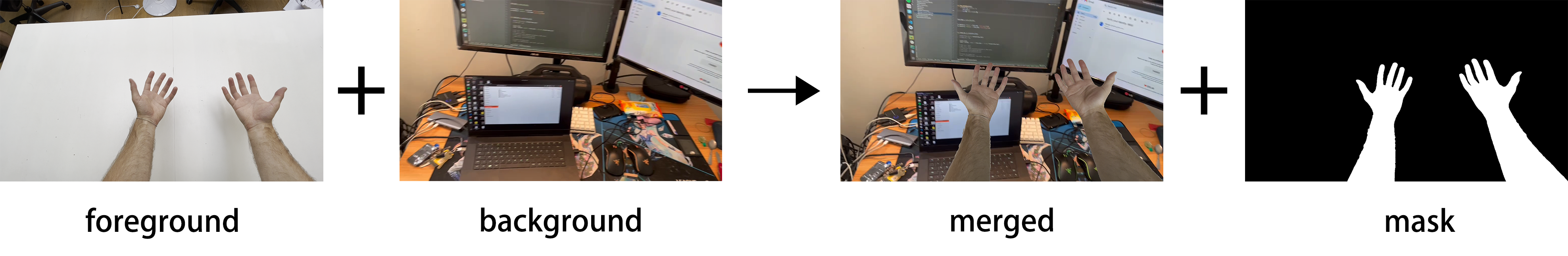 Figure 1. The procedure of dataset creation: we remove the white screen in the foreground to get the mask, and then combine the masked foreground and background to get the merged images.