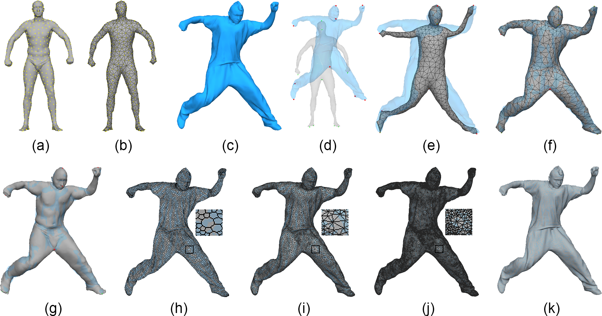 Huber-L1 algorithm: (a) Sampled points (yellow dots); (b) Remeshing from the sampled points as embedded coarse mesh; (c) Input of target surface; (d) 9 feature points specified by user (red dots for target and green dots for template); (e) Coarse fitting; (f) Mid-scale fitting; (g) Reconstructed through embedded deformation; (h) Fine fitting on the dual domain; (i) Fine fitting on the primal domain; (j) Subdivision; (k) The final result.